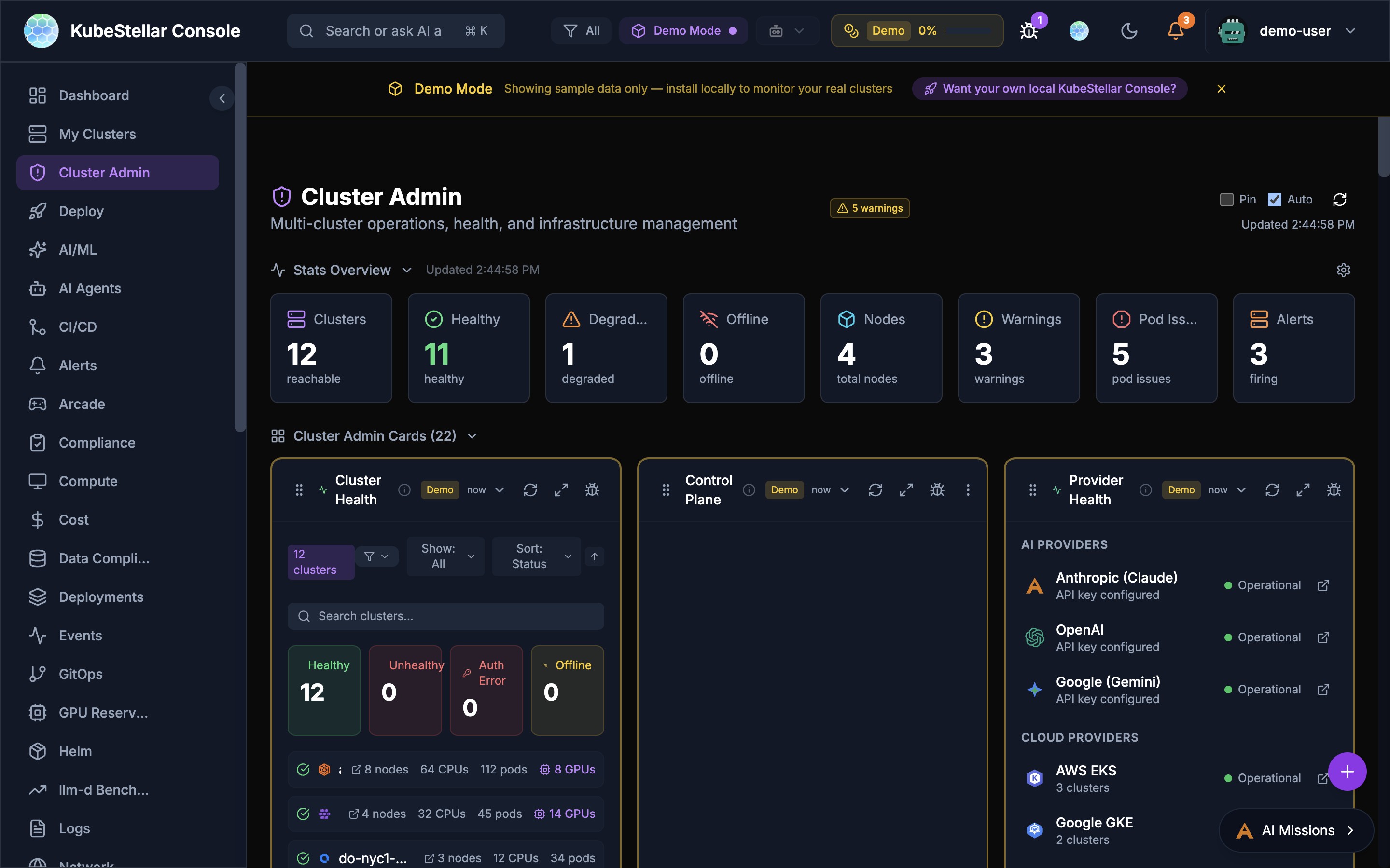 # Card What it shows 64 Provider Health Status of AI providers (Claude, OpenAI, Gemini) and cloud providers
