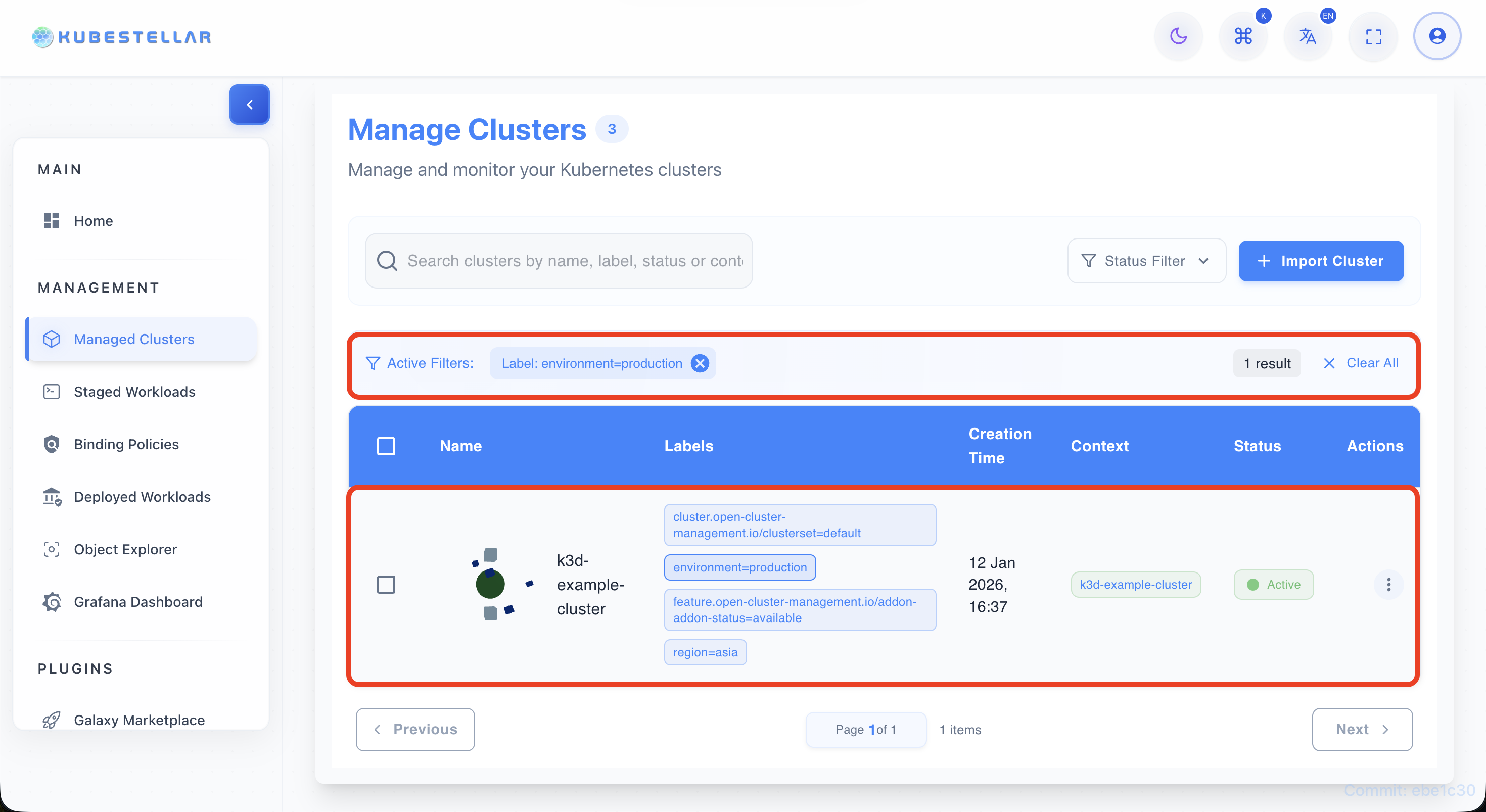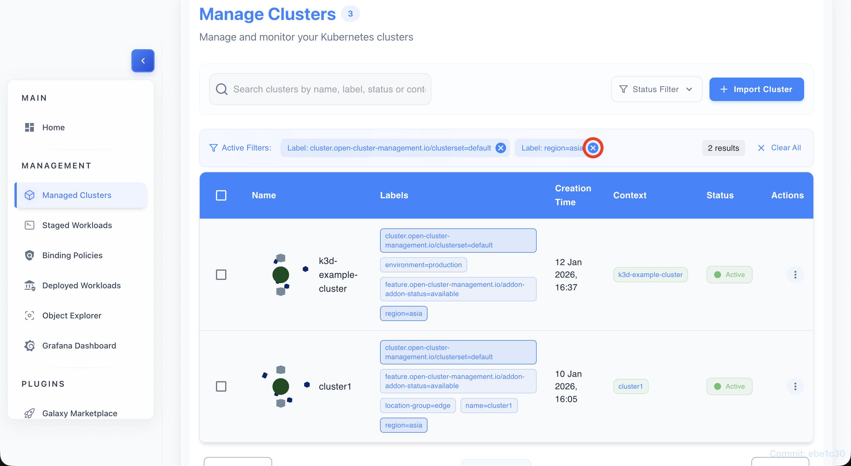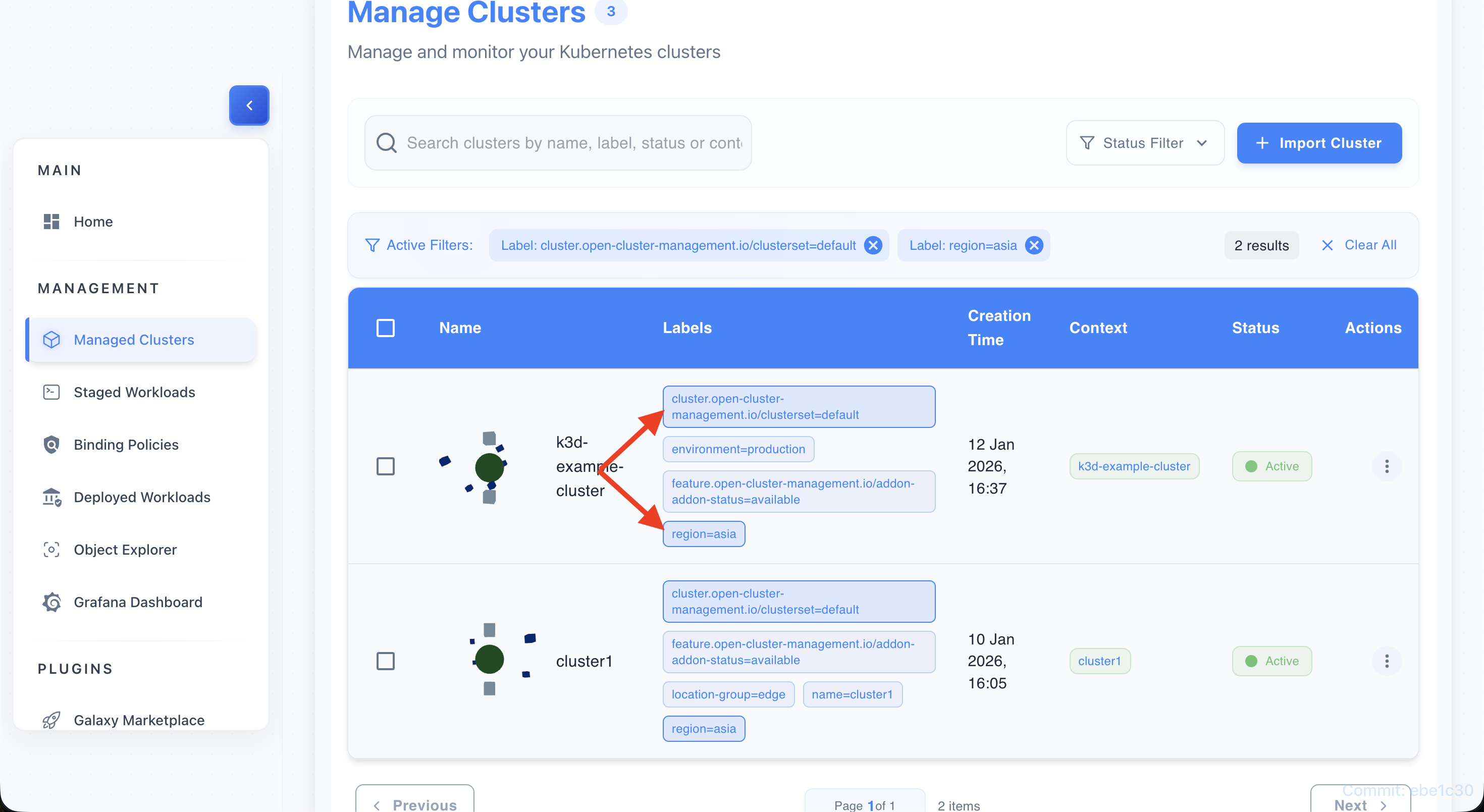 - The table updates to show only clusters matching the selected label.