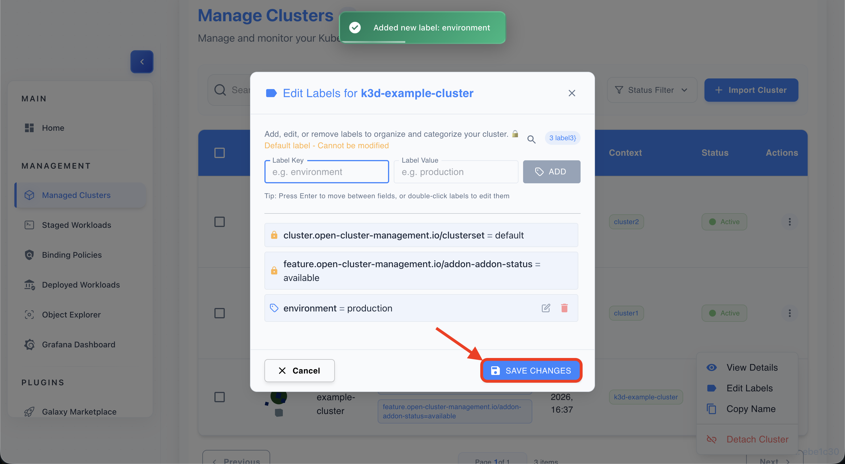 - Save changes to apply labels to the cluster.