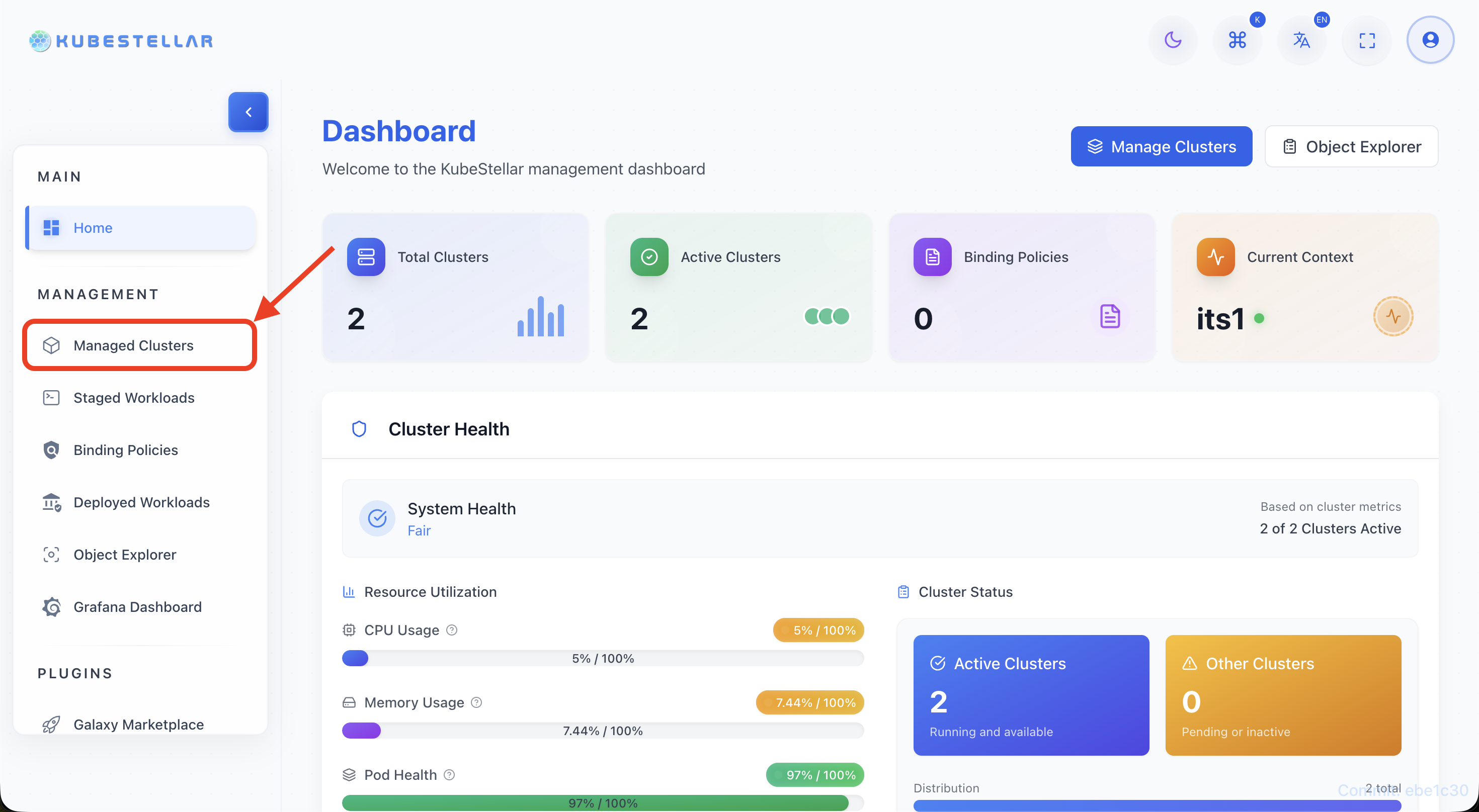 - Open the KubeStellar dashboard and select “Managed Clusters” from the main menu.